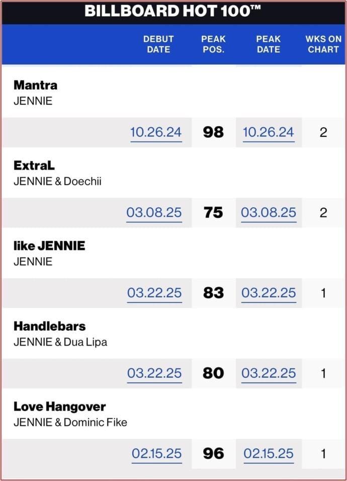 Album RUBY không chỉ dừng lại ở đó. Nó còn có tổng cộng 5 bài hát lọt vào Billboard HOT 100, bao gồm like JENNIE, Mantra, Love Hangover, ExtraL và Handlebars. Nếu tính cả One of the Girls – sản phẩm hợp tác giữa Jennie, The Weeknd và Lily-Rose Depp, thì cô nàng đang nắm giữ kỷ lục với tổng cộng sáu bài hát từng xuất hiện trên Billboard HOT 100. Đây không chỉ là một cột mốc quan trọng trong sự nghiệp cá nhân của Jennie mà còn là một dấu ấn đáng tự hào cho nền âm nhạc Kpop trên trường quốc tế.