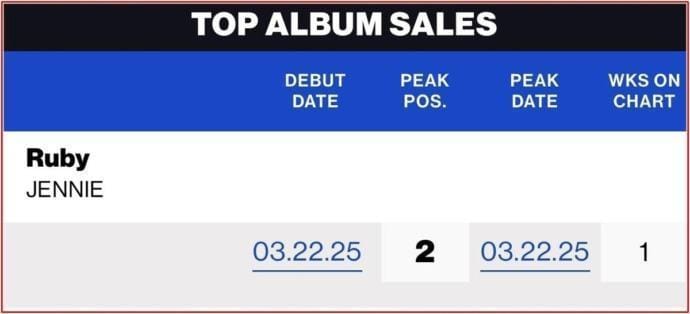 Album RUBY còn lập kỷ lục về doanh số tuần đầu cao nhất đối với một nữ nghệ sĩ solo Kpop trong năm 2025 với 661.130 bản được bán ra. Nó cũng xuất sắc ra mắt ở vị trí số 3 trên Bảng xếp hạng album chính thức của Vương quốc Anh – một thành tích chưa từng có đối với một nữ nghệ sĩ solo Kpop. Điều này cho thấy sức hút mạnh mẽ của Jennie không chỉ tại thị trường châu Á mà còn trên các bảng xếp hạng phương Tây.