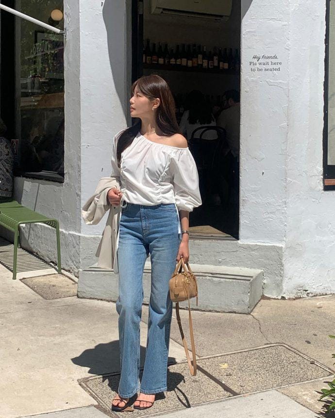 Các quý cô sành điệu thường kết hợp áo blouse trắng với quần jeans xanh. Công thức này siêu “hack” tuổi và giúp vẻ ngoài trở nên cuốn hút hơn.