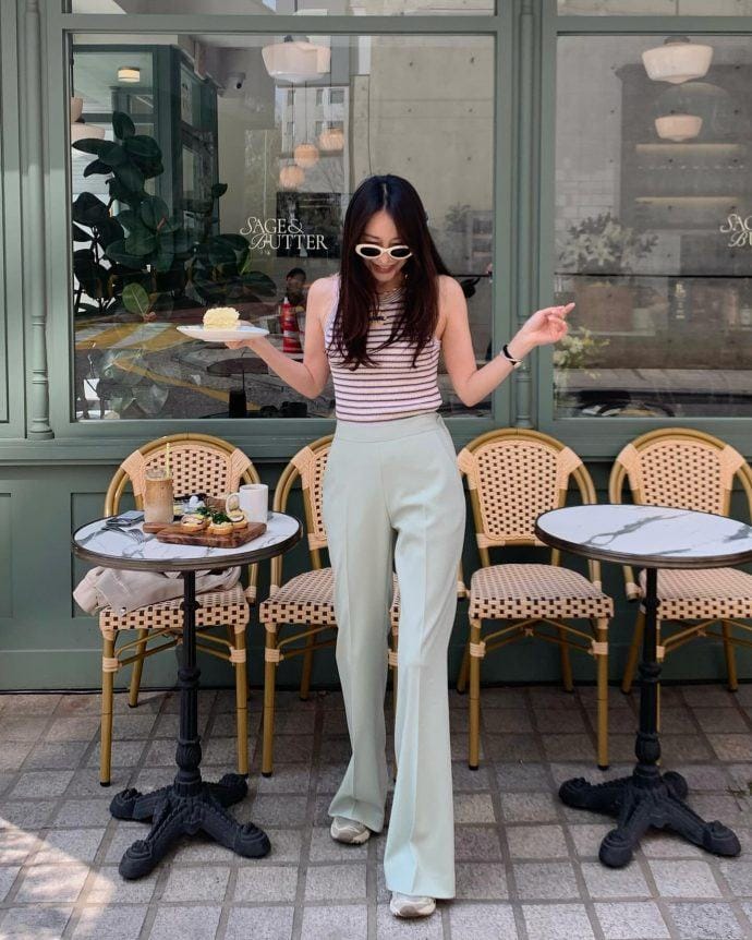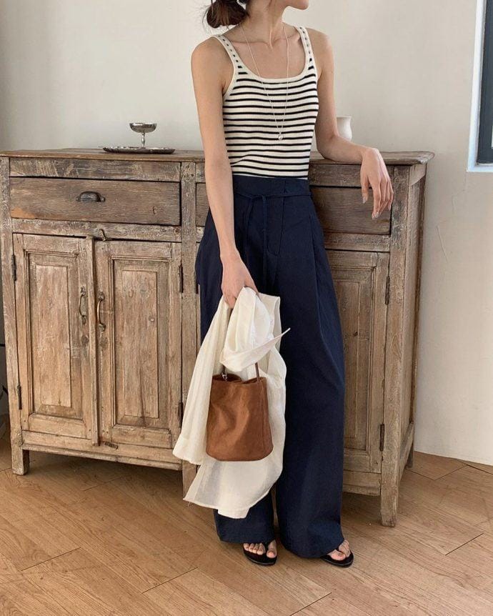Áo hai dây có nhiều biến tấu để các nàng lựa chọn và thay vì chỉ diện áo trơn màu, chị em hãy thử phiên bản kẻ ngang đang khá được ưa chuộng. Áo hai dây kẻ ngang nổi bật nhưng vẫn đảm bảo sự tinh tế, dịu dàng cho người mặc, nhất là khi được phối cùng quần âu ống suông rồi sơ vin gọn gàng.