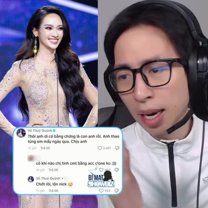 Giữa lúc câu chuyện đang “nóng” nhất, Á hậu Vũ Thúy Quỳnh bất ngờ xuất hiện với một bình luận thẳng thắn dưới video liên quan đến drama. Cô viết: “Thôi anh ơi, có bằng chứng là con anh rồi. Anh thao túng em mấy ngày qua. Chịu anh.” Bình luận này ngay lập tức gây sốt, khiến nhiều người bất ngờ vì sự thẳng thắn của một Á hậu vốn được biết đến với hình ảnh kín tiếng và chuẩn mực.