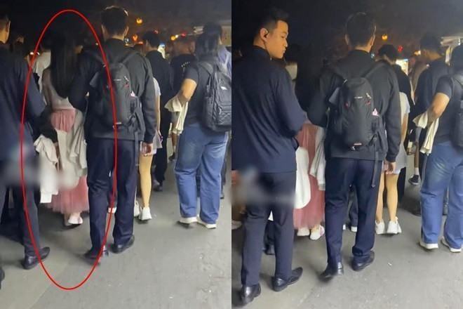 Dạo chơi phố cổ, Phương Nhi và chồng vừa đi vừa được vệ sĩ cẩn thận vây quanh.