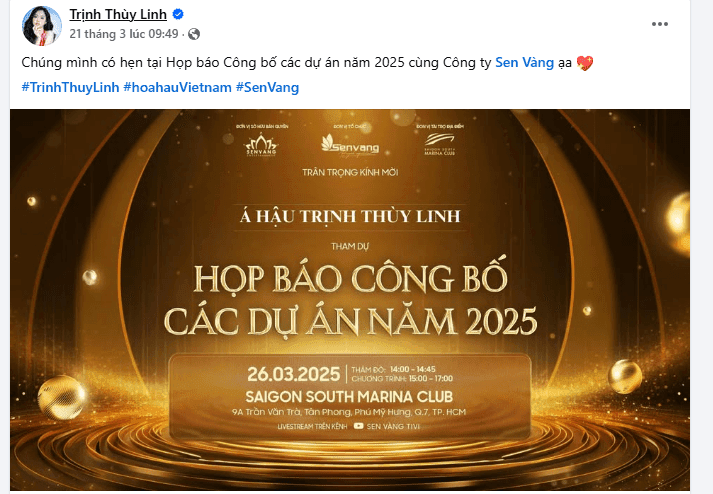 Buổi họp báo công bố dự án năm 2025 của công ty Sen Vàng ngày 26/3 đã quy tụ dàn Hoa hậu đình đám như Huỳnh Trần Ý Nhi, Thanh Thủy, Đỗ Thị Hà… Tuy nhiên, sự kiện này lại gây chú ý hơn cả bởi sự vắng mặt bất thường của Á hậu Trịnh Thùy Linh. Dù trước đó 5 ngày, cô còn hào hứng đăng tải lời mời tham dự, nhưng khi sự kiện diễn ra, người đẹp gen Z lại “bốc hơi” không một lời giải thích.