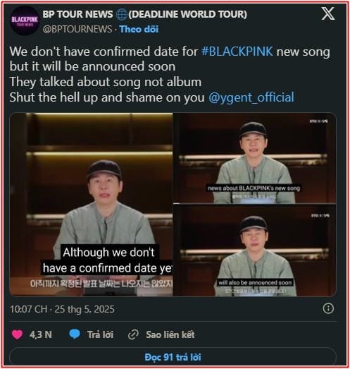 Không khí trong cộng đồng BLINK – fandom của BLACKPINK – đang nóng lên từng giờ sau thông báo mới nhất từ YG Entertainment. Dù công ty đã hé lộ kế hoạch tổ chức tour diễn toàn cầu vào năm 2025, nhưng sự thiếu minh bạch về album mới khiến người hâm mộ không khỏi bức xúc.