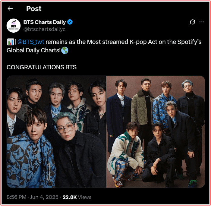 Không chỉ dừng lại ở đó, BTS còn khiến người hâm mộ ngỡ ngàng với trung bình hơn 12 triệu lượt stream mỗi ngày trên toàn cầu. Những bản hit như Dynamite, Butter, Boy With Luv hay My Universe vẫn liên tục “đốt cháy” các bảng xếp hạng, dù nhóm chưa phát hành album mới nào từ năm 2022.