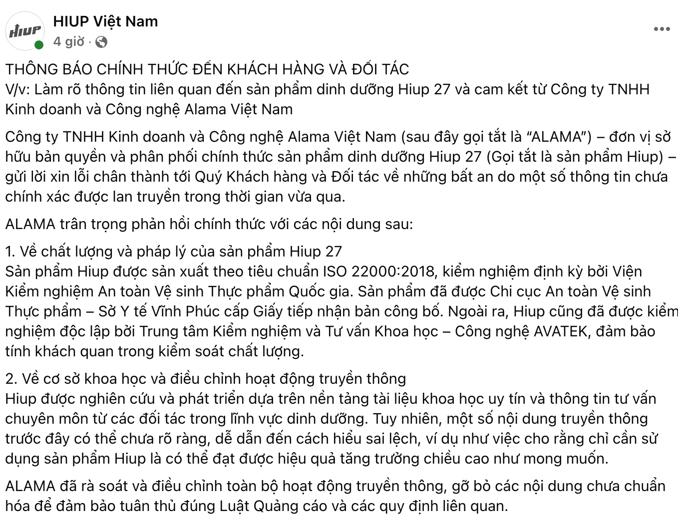 Phía nhãn hàng HIUP cũng lên tiếng khẳng định sản phẩm đạt chuẩn ISO 22000:2018 và đã được kiểm nghiệm độc lập. Công ty này cam kết gỡ bỏ nội dung vi phạm và ngừng hợp tác với các KOL liên quan.