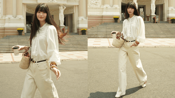 Model Phương Thy gây ấn tượng với vẻ thanh lịch trong chiếc sơ mi tay phồng phối cùng quần denim ống suông. Những chi tiết ren tinh tế và bảng màu trung tính giúp cô toát lên vẻ đẹp quý phái.