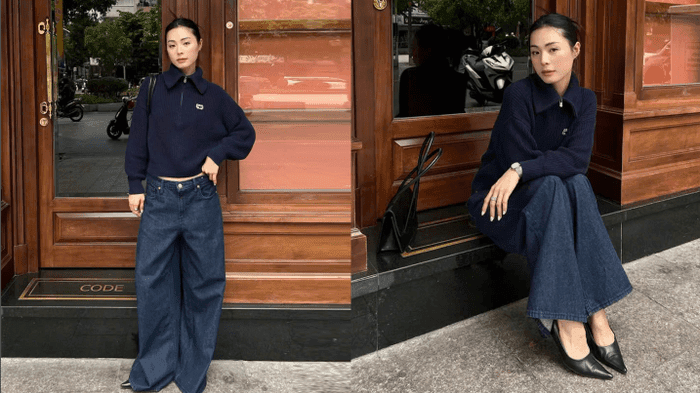 Phương Uyên chọn lối tối giản nhưng không kém phần thời thượng với áo len cổ zip navy và quần jeans baggy. Sự kết hợp giữa chất liệu len mềm mại và denim đứng phom mang đến vẻ ngoài vừa thoải mái vừa cá tính.