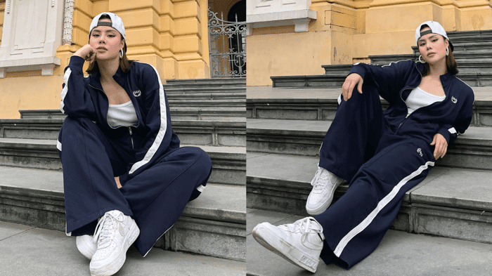 Dancer Song Linh không ngần ngại thể hiện cá tính với bộ tracksuit xanh navy phối cùng áo tank top trắng. Những đường kẻ trắng chạy dọc tay áo và quần không chỉ tôn lên vẻ thể thao mà còn khiến cô nàng trở nên cực kỳ “cool ngầu”.