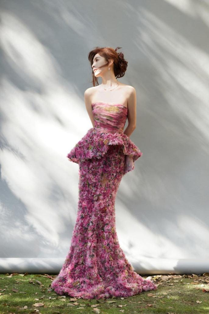 Chương Nhược Nam quyến rũ với váy hoa hồng cúp ngực.