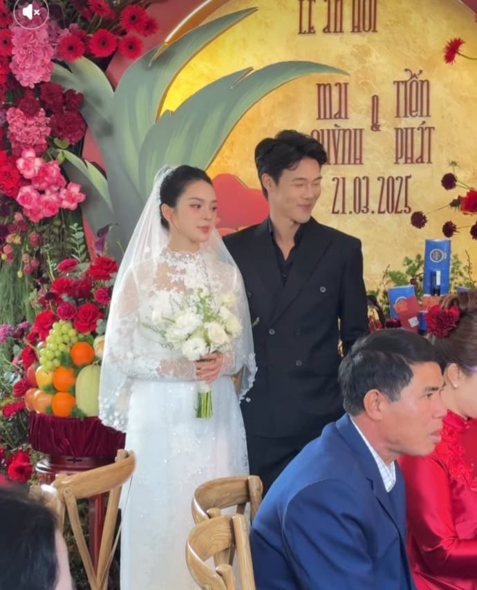 Tiến Phát, chú rể, luôn theo sát vợ từ khi xuất hiện tại buổi lễ cho đến lúc lên xe hoa. Anh liên tục quan tâm, đỡ tay và nắm chặt tay Quỳnh Lương, thể hiện sự chăm sóc tận tình. Trong khi đó, Quỳnh Lương nhẹ nhàng và khép nép bên chồng, thường xuyên cầm hoa cưới khéo léo che chắn vùng bụng.