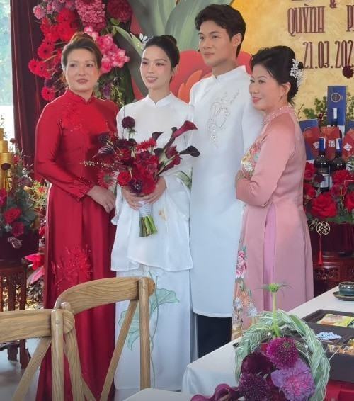 Bộ áo dài thứ hai của Quỳnh Lương được thiết kế bằng chất liệu ren điệu đà, kết hợp với khăn voan mềm mại. Chú rể cũng thay bộ vest truyền thống, khoe vẻ ngoài điển trai. Cả hai tạo nên một cặp đôi hoàn hảo, khiến ai cũng phải ngưỡng mộ.