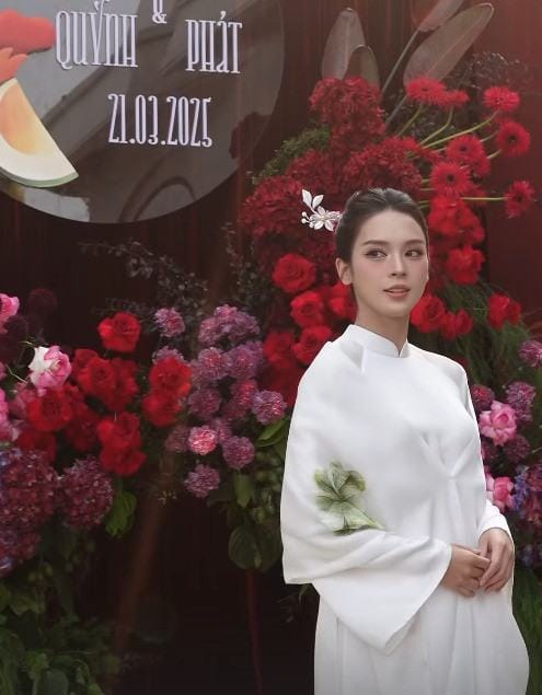 Quỳnh Lương xuất hiện với hai bộ áo dài trắng, mỗi bộ đều mang một vẻ đẹp riêng. Bộ đầu tiên với họa tiết hoa sen mềm mại, tinh khôi, kết hợp cùng khăn choàng che chắn vòng hai bầu bí. Chú rể Tiến Phát cũng diện áo dài đồng điệu, tạo nên sự hài hòa tuyệt đối.