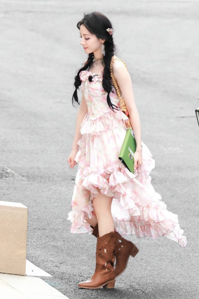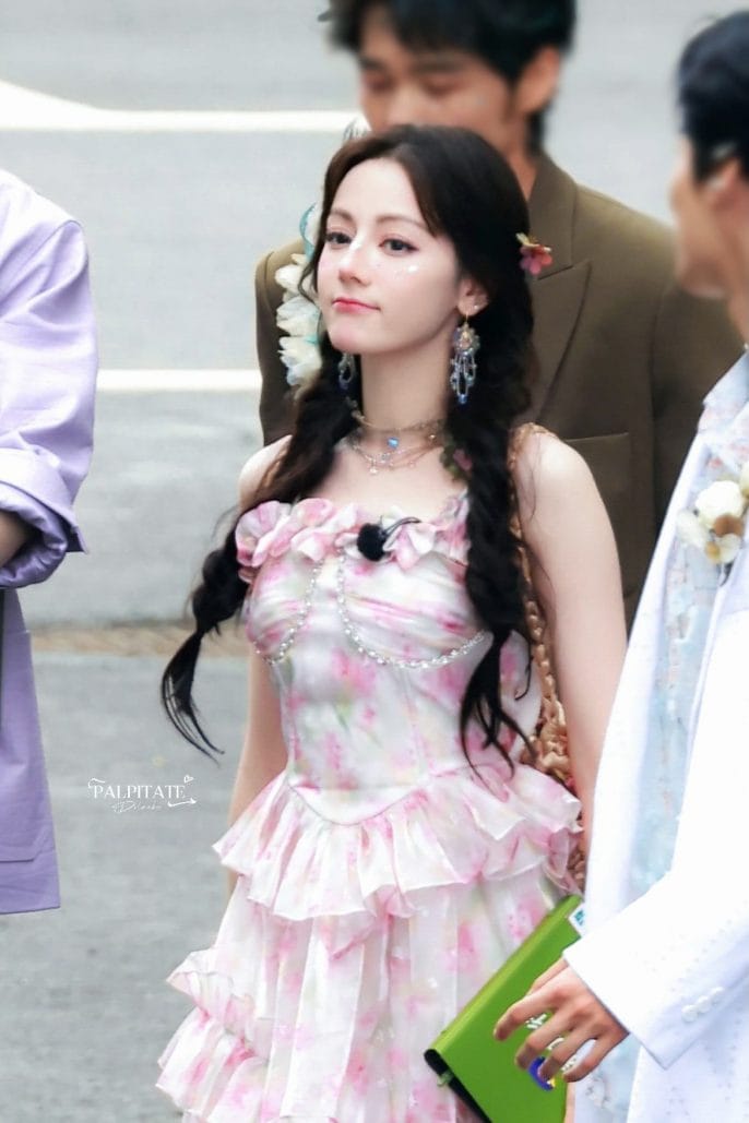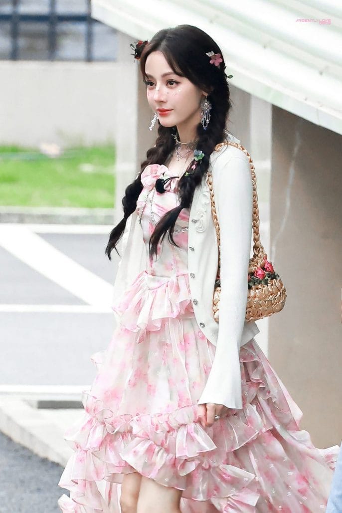 Trong loạt ảnh, Địch Lệ Nhiệt Ba xuất hiện với chiếc váy hai màu trắng hồng, điểm nhấn là những họa tiết hoa nhún bèo tinh tế. Cô như một ‘nàng tiên hoa’ giữa đời thực, toát lên vẻ đẹp tươi trẻ và căng tràn sức sống. Không chỉ vậy, làn da trắng sáng cùng mái tóc đen óng ả càng làm nổi bật thần thái ngôi sao của cô.