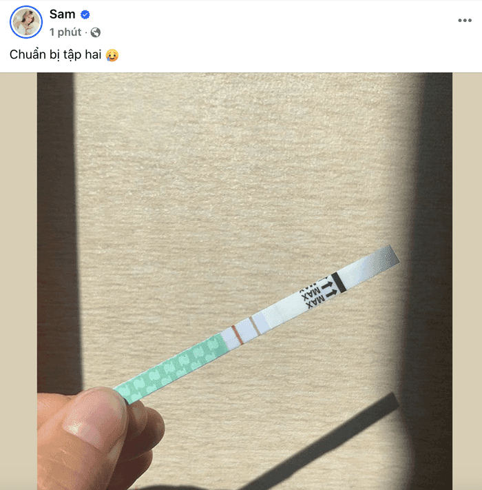 Sáng ngày 1/4, diễn viên Sam bất ngờ chia sẻ hình ảnh que thử thai hai vạch trên trang cá nhân, kèm theo dòng trạng thái ngắn gọn: “Chuẩn bị tập hai” cùng biểu tượng đổ mồ hôi. Bài đăng ngay lập tức trở thành tâm điểm chú ý, khiến dân mạng đặt nghi vấn liệu cô đang ngầm thông báo tin vui mang thai lần hai.