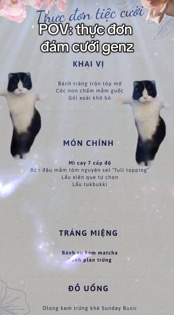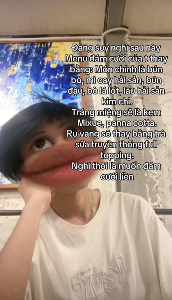 Mạng xã hội đang xôn xao với trào lưu thiết kế menu cưới theo phong cách Gen Z – không cần cưới, không cần người yêu, chỉ cần một cái bụng biết thèm và trái tim biết đùa vui. Những thực đơn này không chỉ thể hiện sự sáng tạo, hài hước của chủ nhân mà còn khiến ai xem cũng phải bật cười vì độ ‘độc lạ’.