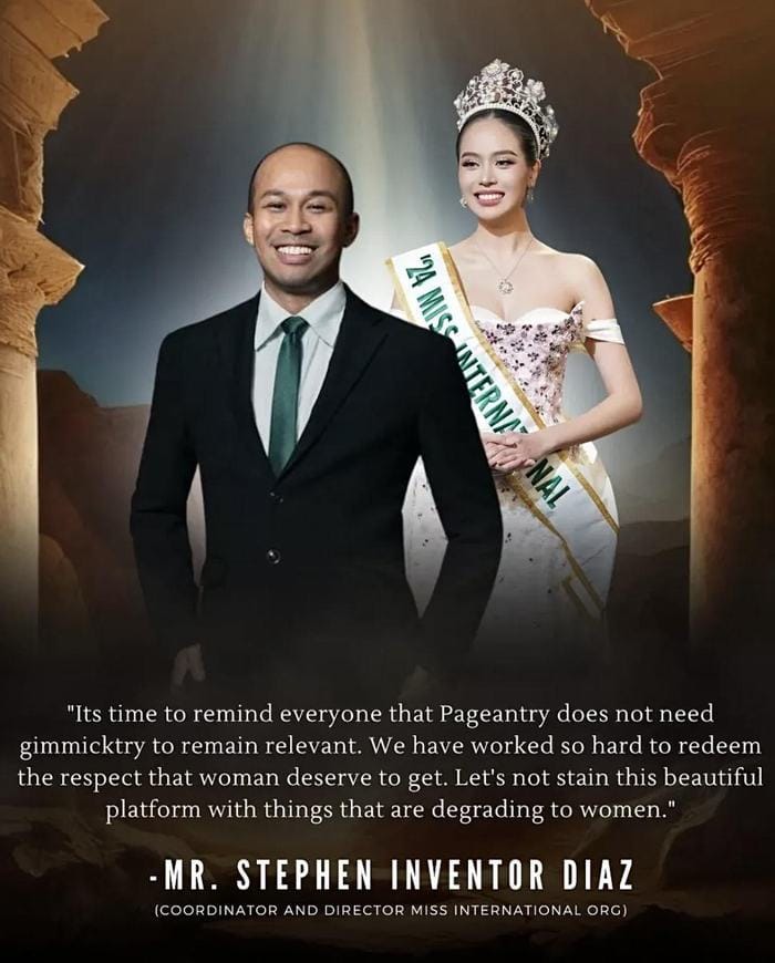 Trong một tuyên bố gây chấn động, ông Stephen Inventor-Diáz, giám đốc truyền thông của Hoa hậu Quốc tế, đã không ngần ngại lên tiếng về thực trạng đáng buồn của các cuộc thi sắc đẹp hiện nay. “Đã đến lúc nhắc nhở mọi người rằng cuộc thi sắc đẹp không cần những mánh khóe để duy trì sự nổi tiếng”, ông nhấn mạnh, đồng thời kêu gọi bảo vệ giá trị của phụ nữ.