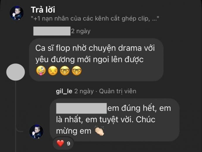 Không chỉ nhận được sự động viên, Gil Lê còn phải đối mặt với những bình luận ác ý từ antifan. Một người thậm chí chê bai sự nghiệp của cô và cho rằng cô chỉ nổi nhờ drama tình cảm. Bình tĩnh nhưng không kém phần sắc sảo, Gil Lê đáp trả: “Em đúng hết, em là nhất, em tuyệt vời. Chúc mừng em”.