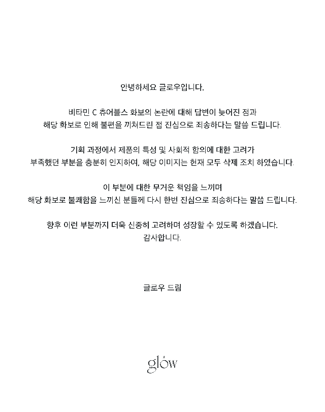Trước làn sóng phản đối, Glow đã nhanh chóng đăng tải lời xin lỗi chính thức trên mạng xã hội, thừa nhận thiếu sót trong quá trình lên ý tưởng và gỡ bỏ toàn bộ hình ảnh gây tranh cãi. Bài đăng xin lỗi của họ nhấn mạnh: “Chúng tôi hoàn toàn nhận thức được rằng trong quá trình lên ý tưởng, chúng tôi đã thiếu sự cân nhắc kỹ lưỡng về đặc tính sản phẩm cũng như những tác động xã hội có thể phát sinh.”
