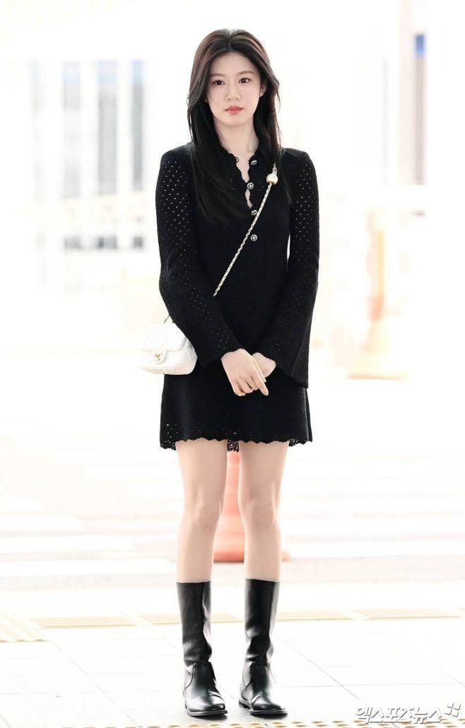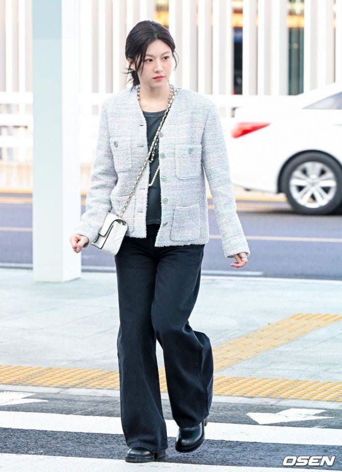 Go Yoon Jung còn có phong cách thời trang sân bay thu hút. Nữ diễn viên gợi ý một số công thức trang phục màu trung tính rất hút mắt như váy ngắn suông màu đen ngọt ngào, thời thượng hay combo áo khoác vải tweed + quần ống rộng + áo thun vừa “cool” vừa thanh lịch.