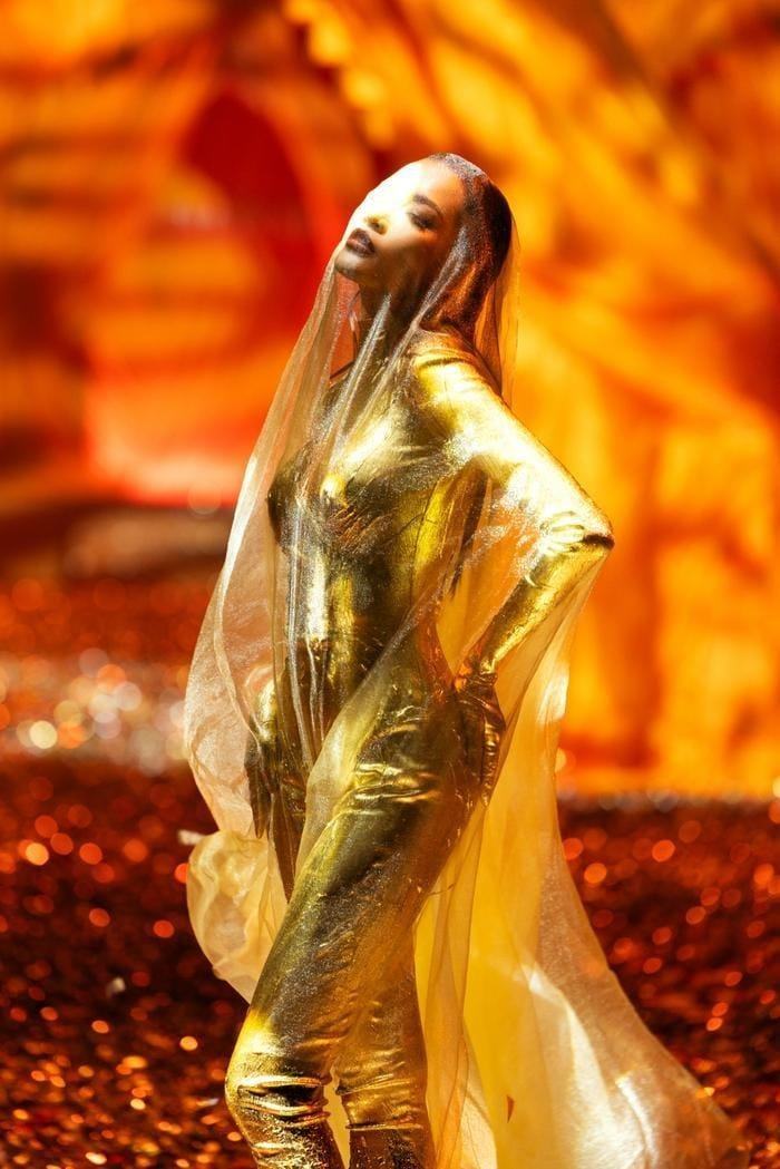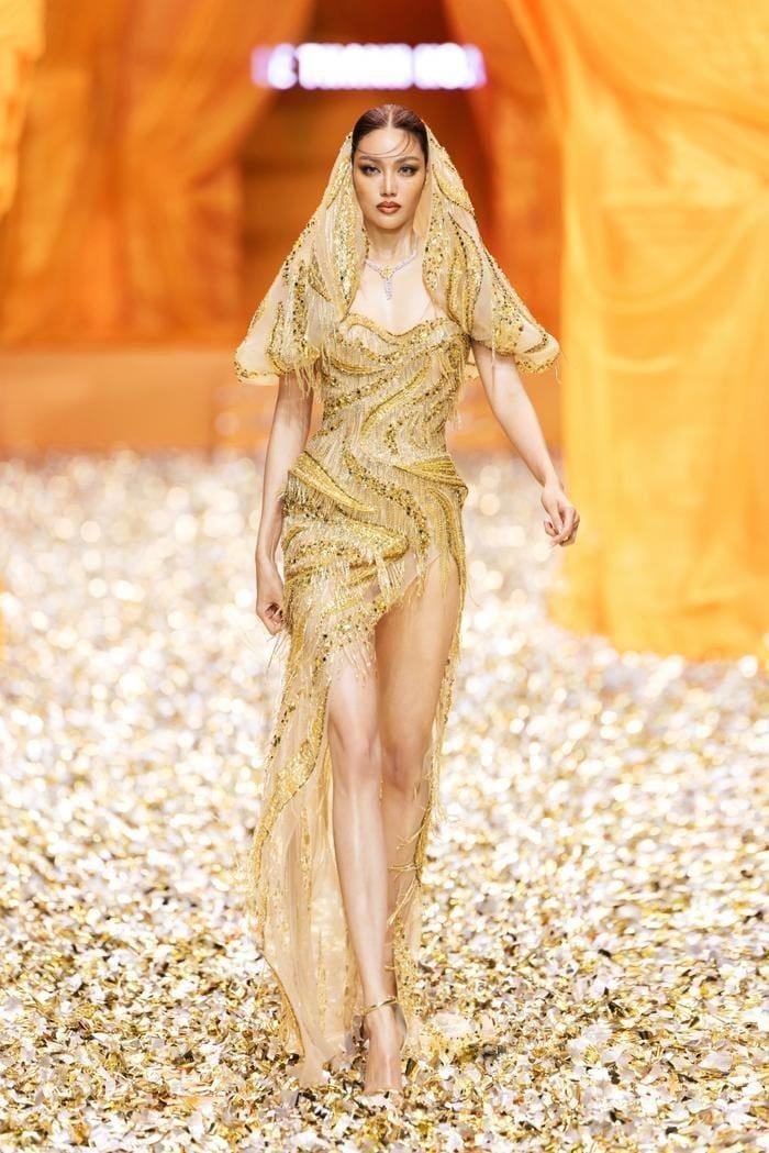 Hoa hậu Lê Hoàng Phương được vinh dự là người mở màn với bộ bodysuit vàng ánh kim, kết hợp cùng chiếc khăn voan mỏng manh. Mỗi bước đi của cô như một điệu múa, uyển chuyển giữa không gian mờ ảo, đầy ma mị.