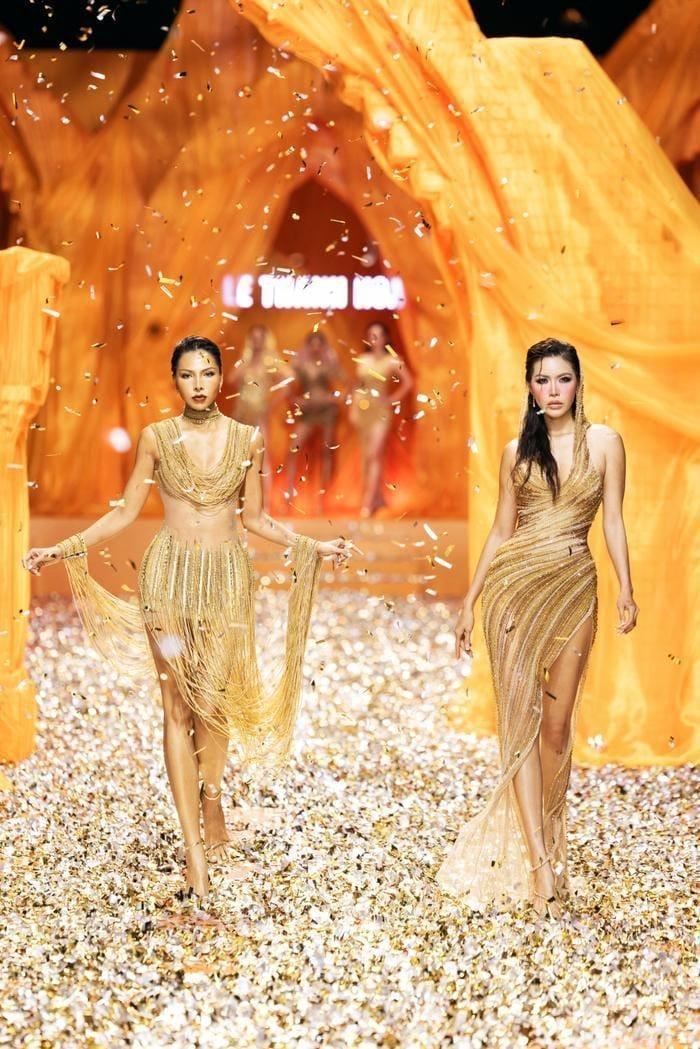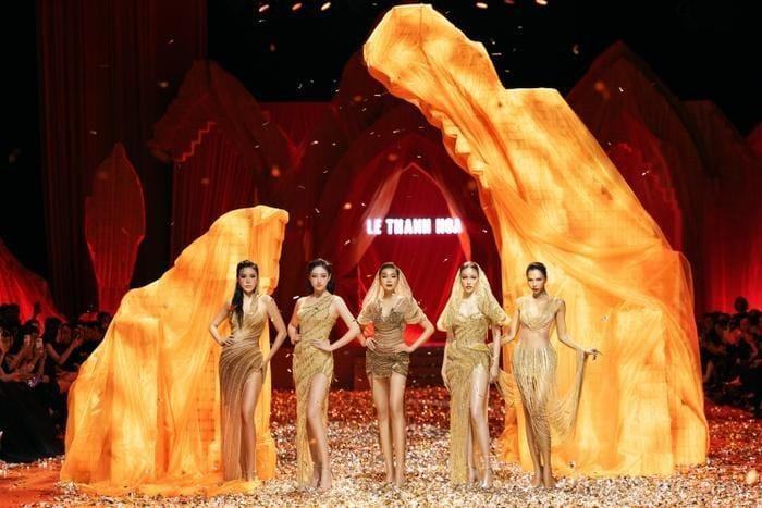 NTK Lê Thanh Hòa đã khiến khán giả trầm trồ với 70 thiết kế lấy cảm hứng từ nghệ thuật điêu khắc Champa. Sự kết hợp tinh tế giữa truyền thống và hiện đại được thể hiện qua từng đường cắt, chất liệu xuyên thấu gợi cảm và những chi tiết tua rua bắt mắt.