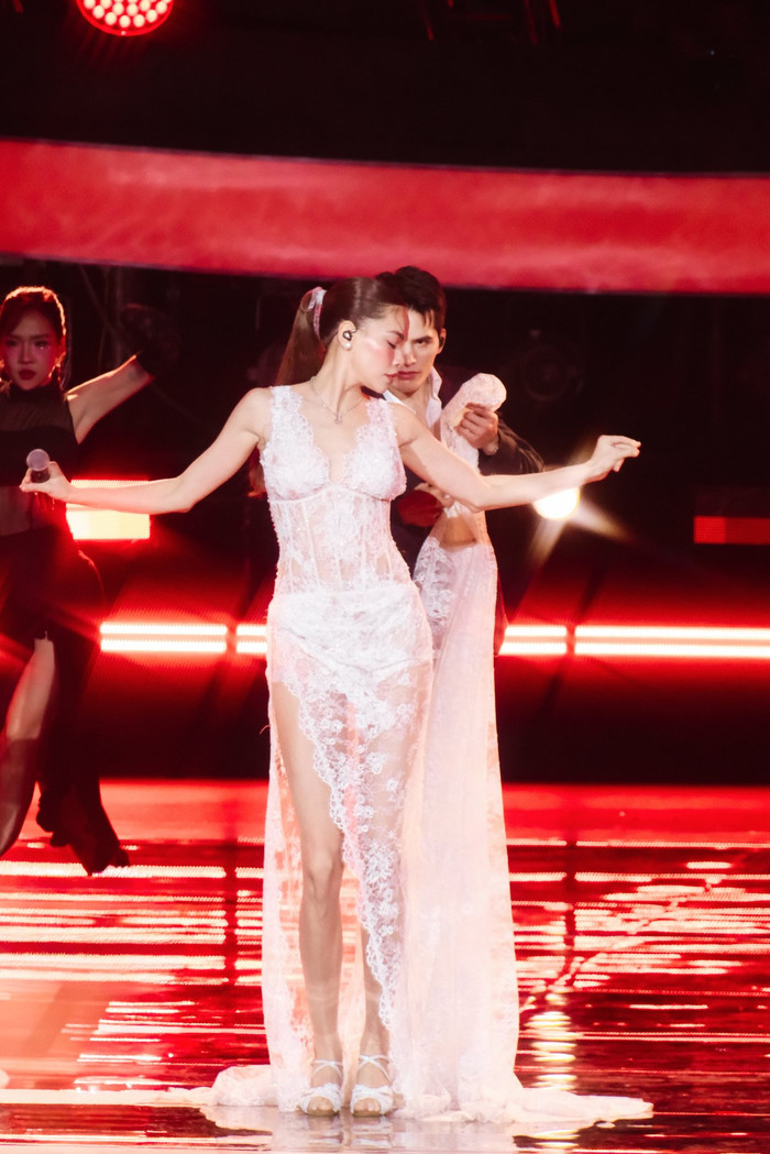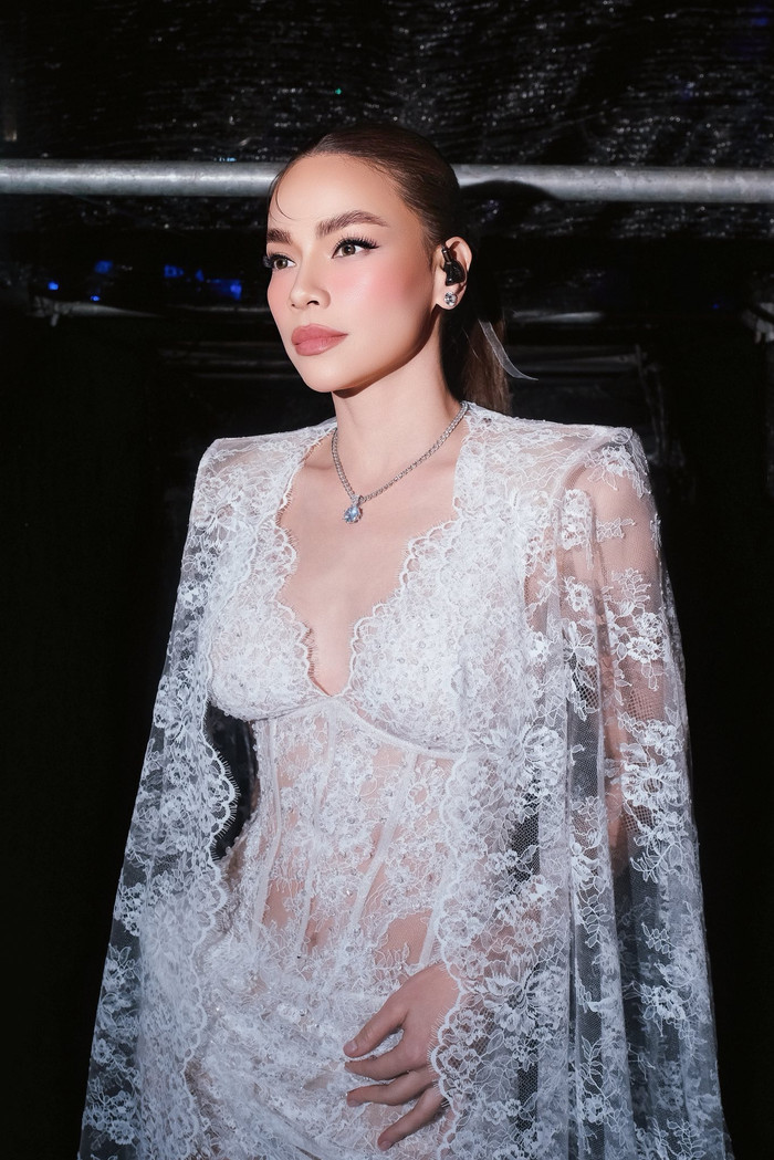 Dưới ánh đèn sân khấu rực rỡ, Hồ Ngọc Hà xuất hiện như một nữ thần với bộ váy ren trắng tinh khôi nhưng không kém phần táo bạo. Từng đường nét trên trang phục xuyên thấu ôm sát cơ thể, phô diễn trọn vẹn đường cong quyến rũ và đôi chân dài miên man khiến người xem không thể rời mắt.