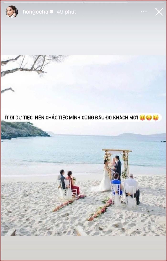 Mạng xã hội một lần nữa chao đảo khi Hồ Ngọc Hà bất ngờ đăng tải loạt ảnh từ một buổi tiệc cưới bên bờ biển. Đi kèm với những khoảnh khắc lãng mạn ấy, “nữ hoàng giải trí” còn khiến cộng đồng mạng xôn xao với dòng trạng thái đầy ẩn ý: “Ít đi dự tiệc. Nên chắc tiệc mình cũng đâu đó khách mời.”