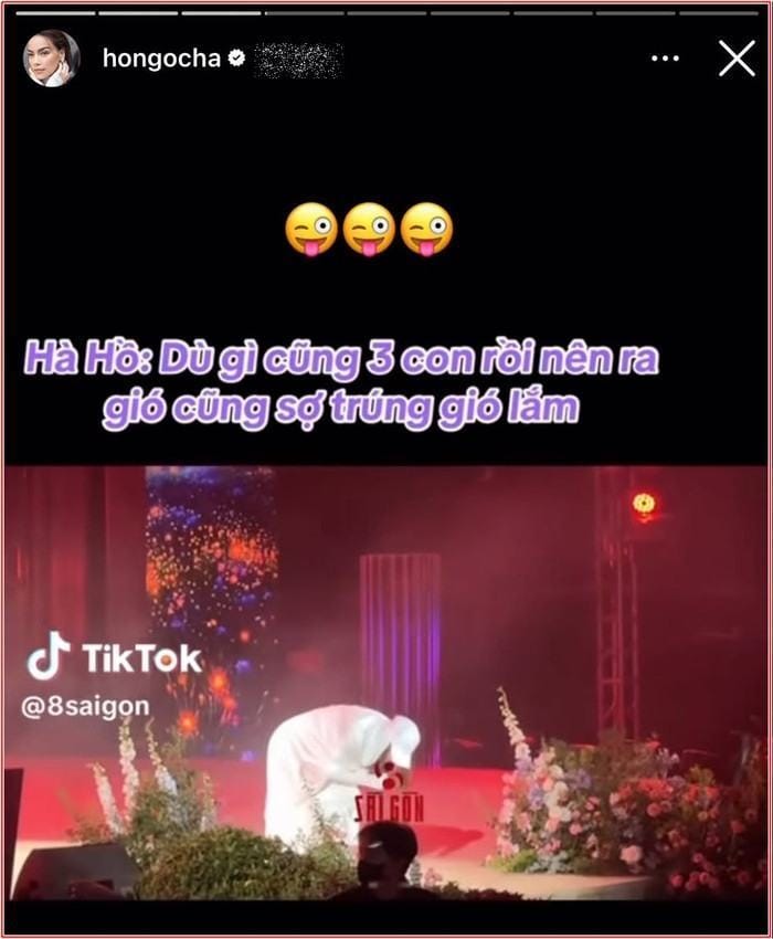 Trước những bình luận hài hước từ người hâm mộ, Hồ Ngọc Hà không ngần ngại đáp lại bằng sự dí dỏm quen thuộc. Cô chia sẻ lại đoạn clip trình diễn trên trang cá nhân kèm dòng trạng thái: “Dù gì cũng ba con rồi nên ra gió cũng sợ trúng gió lắm”. Dẫu vậy, khán giả vẫn thừa hiểu Hà Hồ là nữ ca sĩ luôn biết cách đổi mới và không ngại thử nghiệm những phong cách thời trang sân khấu đi đầu xu hướng tại Vpop. Đó cũng chính là một trong những yếu tố tạo nên sự thành công của Hồ Ngọc Hà, khi luôn khiến khán giả tò mò “Hôm nay cô ấy sẽ mặc gì lên sân khấu?”.