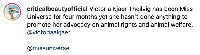 Tuy nhiên, Rafa Delfin, người sáng lập chuyên trang sắc đẹp Critical Beauty, lại có cái nhìn khác. Ông thẳng thắn đặt câu hỏi về sự nghiêm túc của Victoria trong dự án này. Theo Rafa, kể từ ngày đăng quang, Victoria chưa một lần nhắc lại dự án cộng đồng mà cô từng công bố. Trên trang cá nhân, ông không ngần ngại chỉ trích rằng cô “không làm gì để thúc đẩy sự ủng hộ của mình về quyền động vật và phúc lợi động vật”.