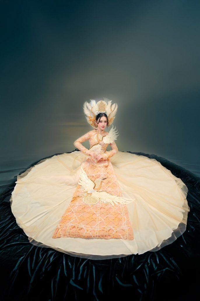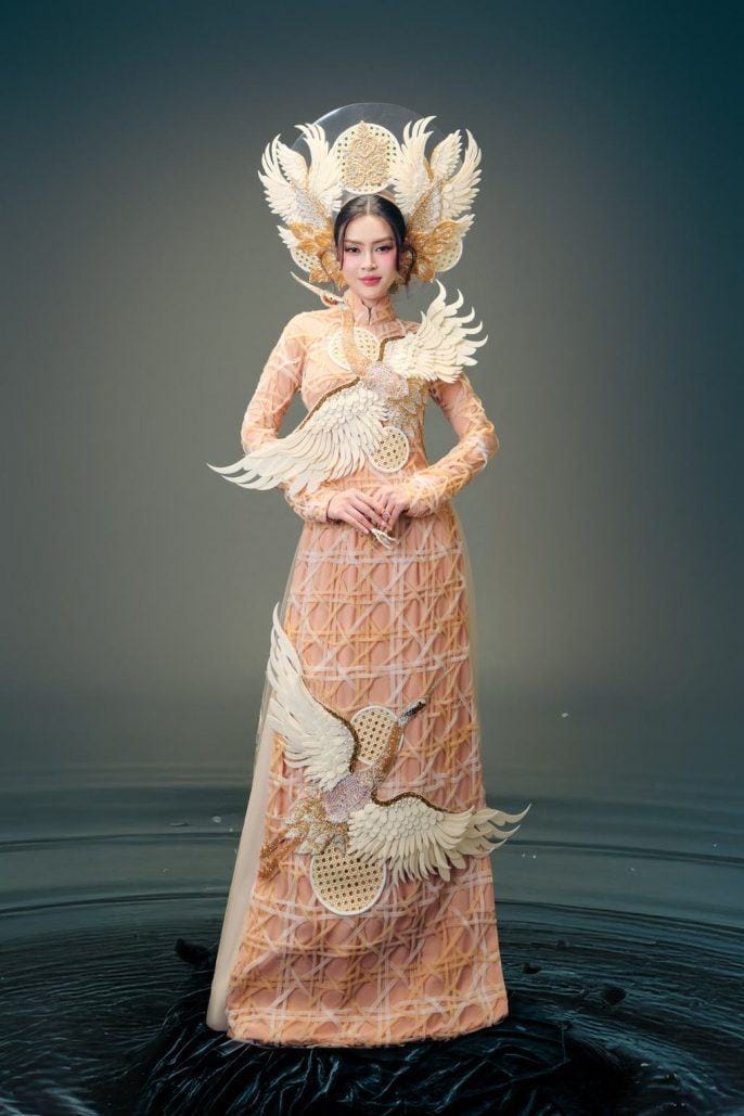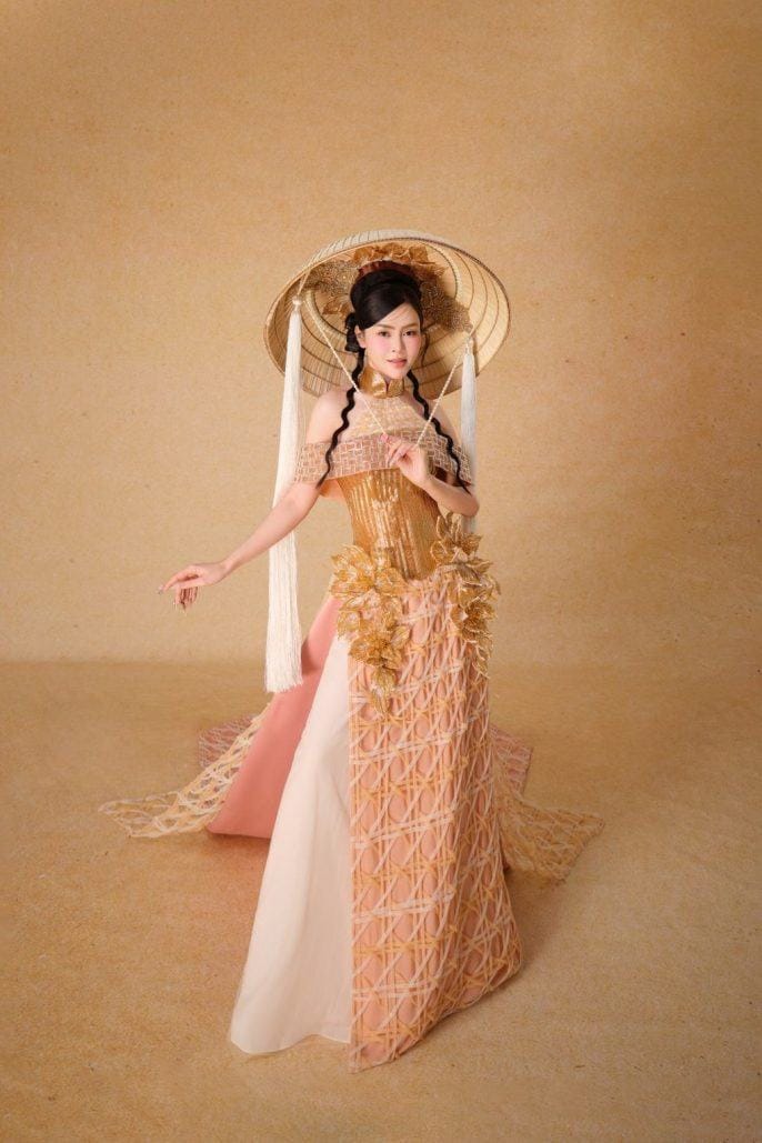Hoa hậu Lý Kim Thảo, người diện thử bộ áo dài, không giấu nổi niềm tự hào: “Thật hãnh diện khi được khoác lên mình tà áo dài truyền thống với họa tiết mây tre đan, góp phần lan tỏa giá trị văn hóa bản sắc.”