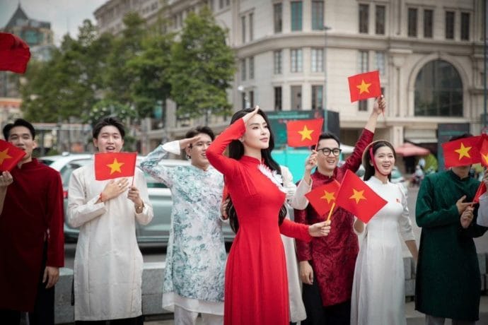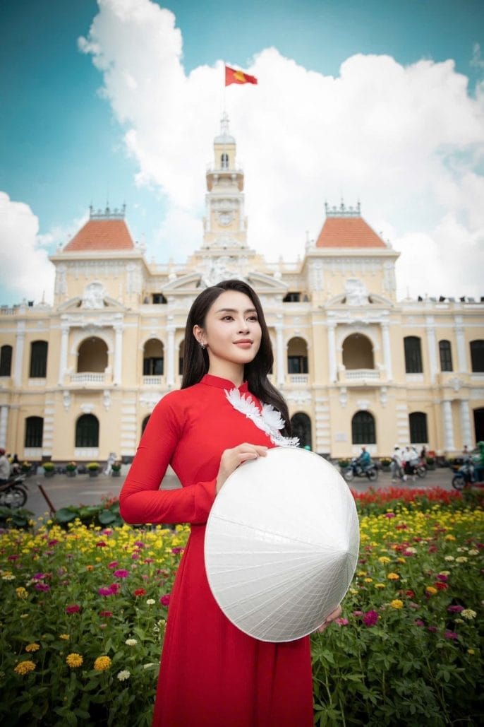 Những ngày này, khi cả nước hướng về kỷ niệm 50 năm Ngày thống nhất đất nước (30/4/1975-30/4/2025), Hoa hậu Lý Kim Thảo đã chọn cách thể hiện lòng tự hào dân tộc một cách đầy nghệ thuật. Cô xuất hiện tại các địa danh nổi tiếng của TPHCM trong bộ áo dài đỏ rực rỡ, thêu hình cánh chim bồ câu trắng – biểu tượng của hòa bình và tự do.
