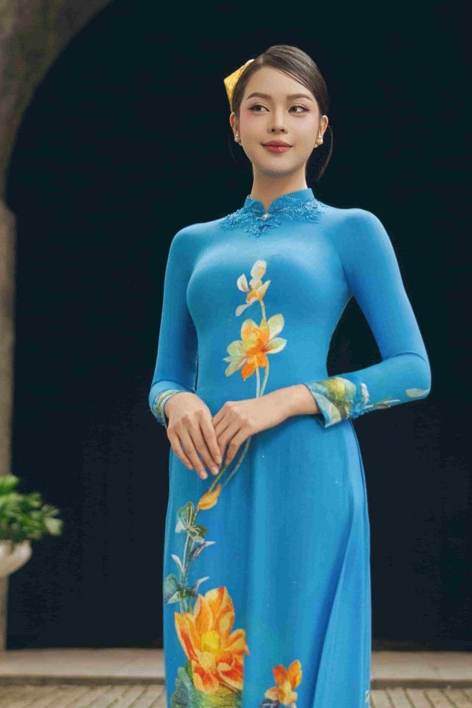 Trong tà áo dài vàng rực rỡ, Thanh Thủy như một nàng công chúa hiện đại giữa không gian cổ điển. Thiết kế mang đậm dấu ấn hoàng gia, kết hợp hài hòa giữa truyền thống và hiện đại, khiến người xem không khỏi trầm trồ.