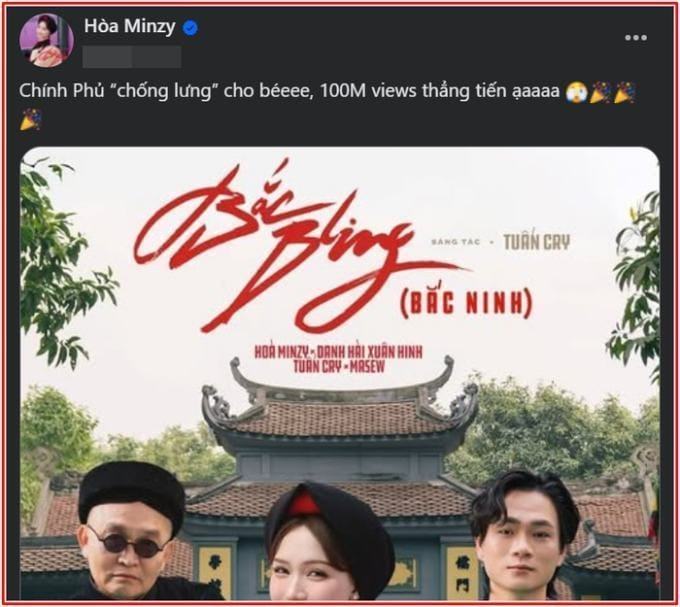 Không chỉ dừng lại ở bài viết, nữ ca sĩ còn hào hứng chia sẻ: “Chính phủ ‘chống lưng’ cho bé, 100 triệu view thẳng tiến ạ”. Niềm vui của Hòa Minzy còn được nhân đôi khi Thủ tướng Phạm Minh Chính đích thân nhắc đến MV Bắc Bling trong một sự kiện quan trọng, thậm chí hỏi về số lượt xem.