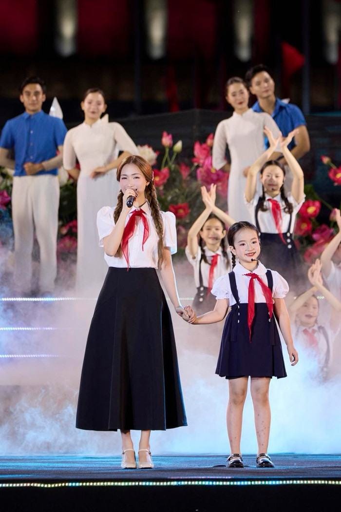 Hòa Minzy xuất hiện trong tiết mục mở màn, cùng các em nhỏ và nghệ sĩ múa, mang đến liên khúc ba ca khúc nổi tiếng về Bác Hồ. Giọng hát đầy cảm xúc của cô đã chạm đến trái tim khán giả, tạo nên khoảnh khắc đáng nhớ giữa không gian linh thiêng.