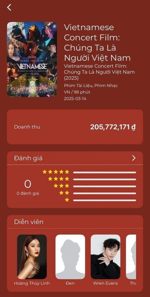 Chỉ sau hơn một tuần công chiếu, “Vietnamese Concert Film: Chúng ta là người Việt Nam” của Hoàng Thùy Linh đã gây chú ý với doanh thu khiêm tốn chỉ hơn 200 triệu đồng. Dù được đầu tư công phu, bộ phim tài liệu âm nhạc này lại không thể tạo nên cơn sốt như kỳ vọng, để lại nhiều tiếc nuối cho người hâm mộ.