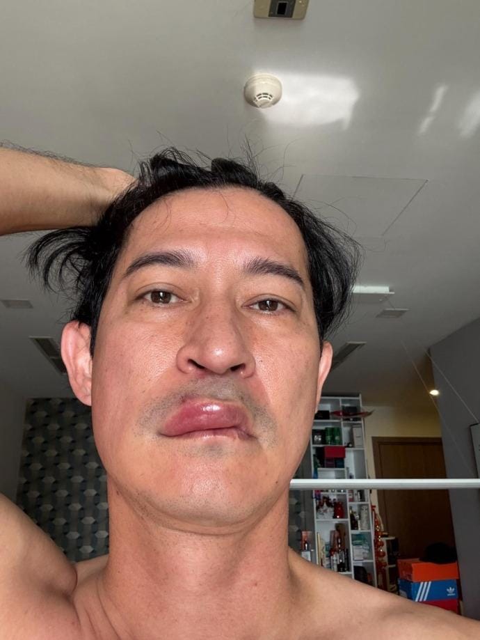 Trước đó, vào ngày 31/3, nam diễn viên khiến nhiều người giật mình khi xuất hiện với đôi môi sưng phù, biến dạng. Anh cho biết khi thức dậy, gương mặt đã thay đổi bất thường, buộc phải hủy bỏ lịch trình công việc.