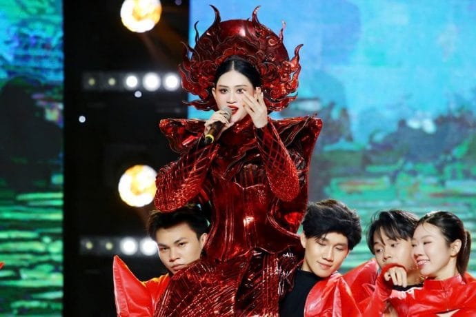 Không dừng lại ở đó, Jee Trần còn đưa kỹ thuật hát ả đào và nghệ thuật múa chén trong ca Huế vào phần trình diễn. Cô thậm chí đu mình lên cây tre, di chuyển linh hoạt dù đang mặc bộ trang phục cồng kềnh. Những vết bầm dọc hai cánh tay là minh chứng cho sự hy sinh của cô, nhưng trên sân khấu, Jee Trần vẫn tỏa sáng với năng lượng bất tận.