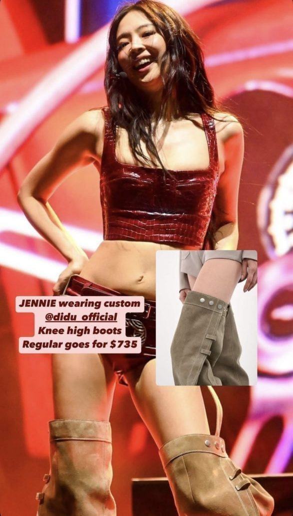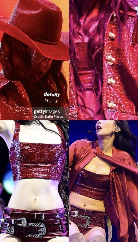 Không cần liên tục thay đổi trang phục như đồng nghiệp Lisa, Jennie chọn cách tạo điểm nhấn bằng sự nhất quán. Cô xuất hiện với bộ trang phục đỏ rực, kết hợp áo ngắn, quần siêu ngắn và áo khoác da cá tính, cùng đôi boots cao gót trị giá gần 18 triệu đồng.