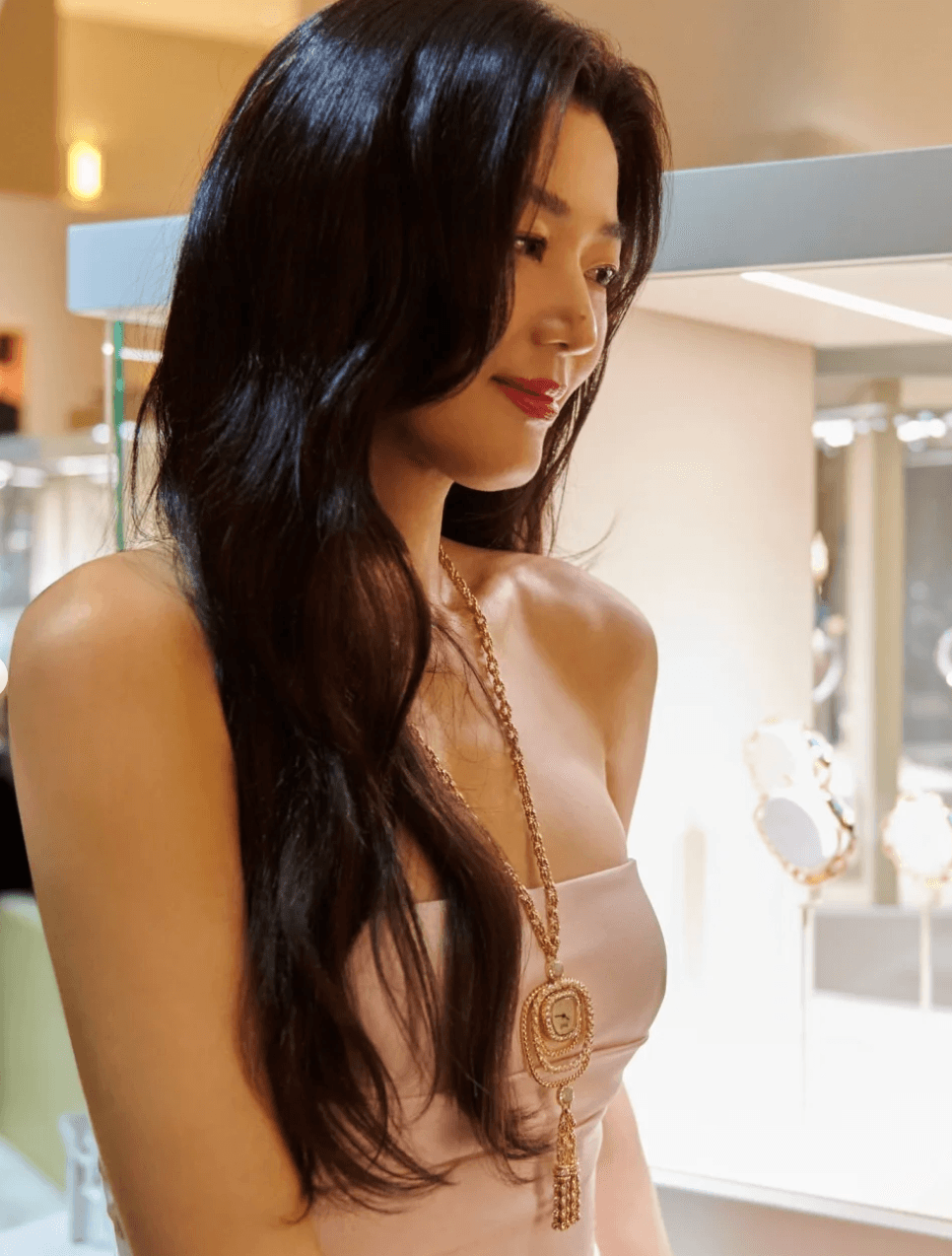 Không dừng lại ở đó, Jun Ji Hyun còn xuất hiện tại sự kiện Watches and Wonders 2025 ở Geneva, Thụy Sĩ, nơi cô diện váy hồng cúp ngực khoe đường cong quyến rũ. Bộ trang sức kim cương và sapphire vàng Essence of Extraleganza High Jewellery càng làm nổi bật đẳng cấp của cô.
