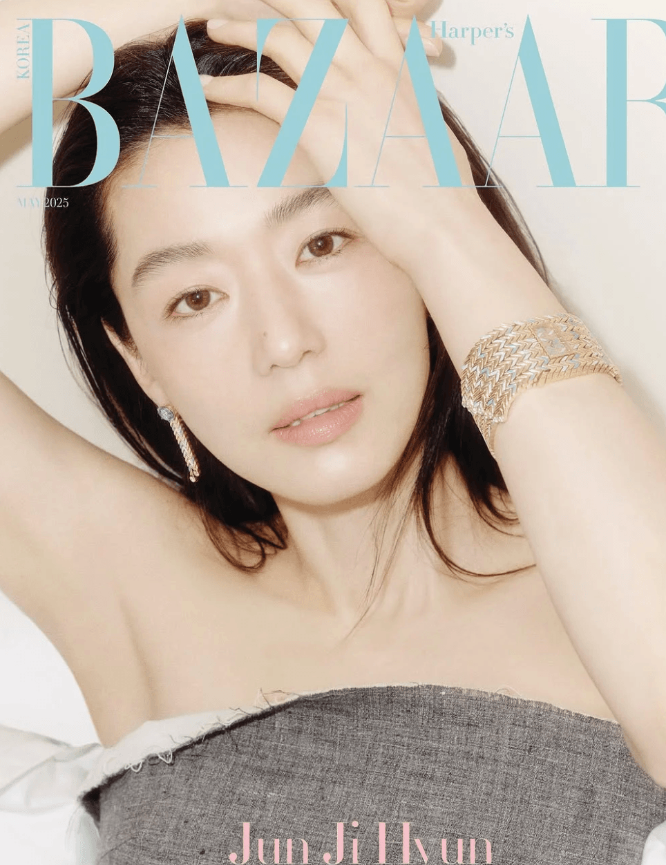 Trên trang bìa tạp chí Harper’s Bazaar Hàn Quốc, Jun Ji Hyun tỏa sáng với thiết kế cúp ngực màu xám, khoe bờ vai thanh mảnh. Những món trang sức độc đáo như vòng tay và khuyên tai càng làm nổi bật vẻ đẹp của cô.