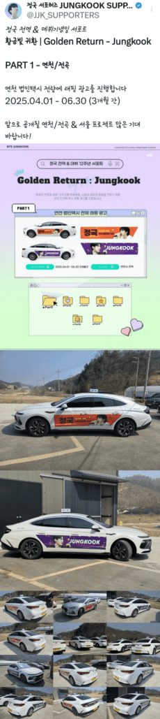 Chưa cần chờ đến ngày xuất ngũ, Jungkook – “em út vàng” của BTS đã khiến đường phố Hàn Quốc “nóng” lên với loạt dự án đặc biệt từ người hâm mộ. Câu lạc bộ fan “Jungkook Supporters” đã bắt đầu chiến dịch kéo dài 3 tháng, từ 1/4 đến 30/6, tại Yeoncheon (Gyeonggi-do) – nơi nam thần tượng đang phục vụ quân ngũ. Hàng loạt taxi phủ hình ảnh toàn thân của Jungkook lăn bánh khắp các con phố, kèm thông điệp đầy cảm xúc: “Sự trở lại vàng son của Jungkook – Thời điểm để bay cao trở lại”.