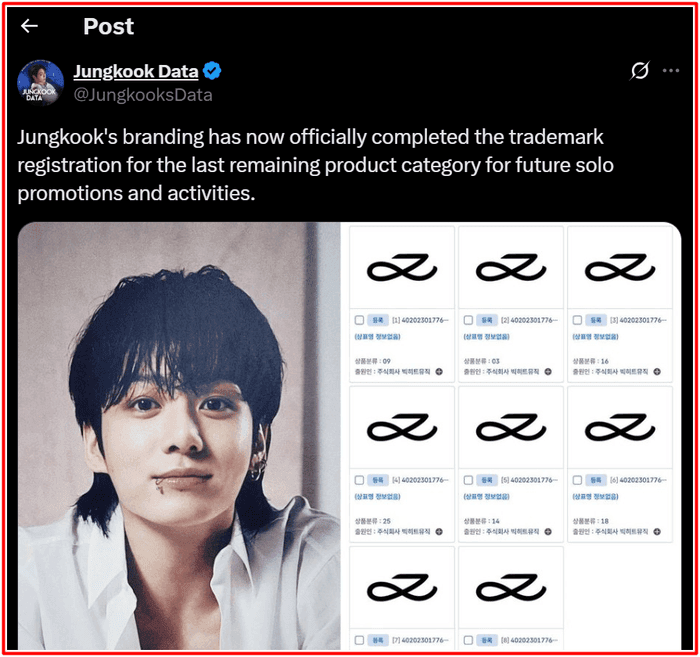 Trong khi nhiều nghệ sĩ Kpop chỉ dừng lại ở việc tạo cơn sốt âm nhạc, Jungkook – thành viên trẻ nhất của BTS – đã chứng minh mình không chỉ là một thần tượng, mà còn là một thương hiệu toàn cầu. Dù đang thực hiện nghĩa vụ quân sự, nam ca sĩ vẫn không ngừng củng cố tên tuổi bằng một bước đi táo bạo: đăng ký logo cá nhân tại các thị trường chiến lược như Mỹ, châu Âu, Nhật Bản và Hàn Quốc.