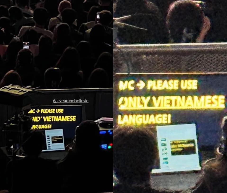 Khánh Vy, người được BTC mời làm MC, đã khiến cộng đồng mạng dậy sóng khi liên tục sử dụng tiếng Hàn và tiếng Anh trong phần giao lưu với Jisoo. Điều này trái ngược hoàn toàn với yêu cầu “chỉ sử dụng tiếng Việt” từ phía ban tổ chức. Một tấm ảnh được lan truyền cho thấy dòng chữ “MC: Please use only Vietnamese Language!” được hiển thị phía sau sân khấu, như một lời nhắc nhở không thể rõ ràng hơn.