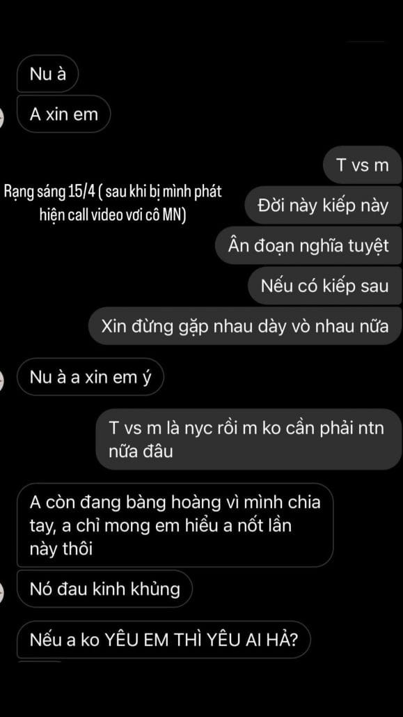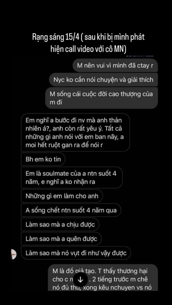 Mọi chuyện vỡ lở khi Lim Feng phát hiện W ngoại tình với dancer MN. Dù W nhiều lần phủ nhận, thậm chí chê bai MN, nhưng sự thật không thể che giấu mãi. Đêm 12/4, cô bắt gặp W hẹn hò lén lút với MN, dẫn đến chia tay ngay lập tức. W khóc lóc xin lỗi, hứa hẹn sẽ thay đổi, nhưng chỉ vài ngày sau lại tiếp tục liên lạc với người thứ ba.