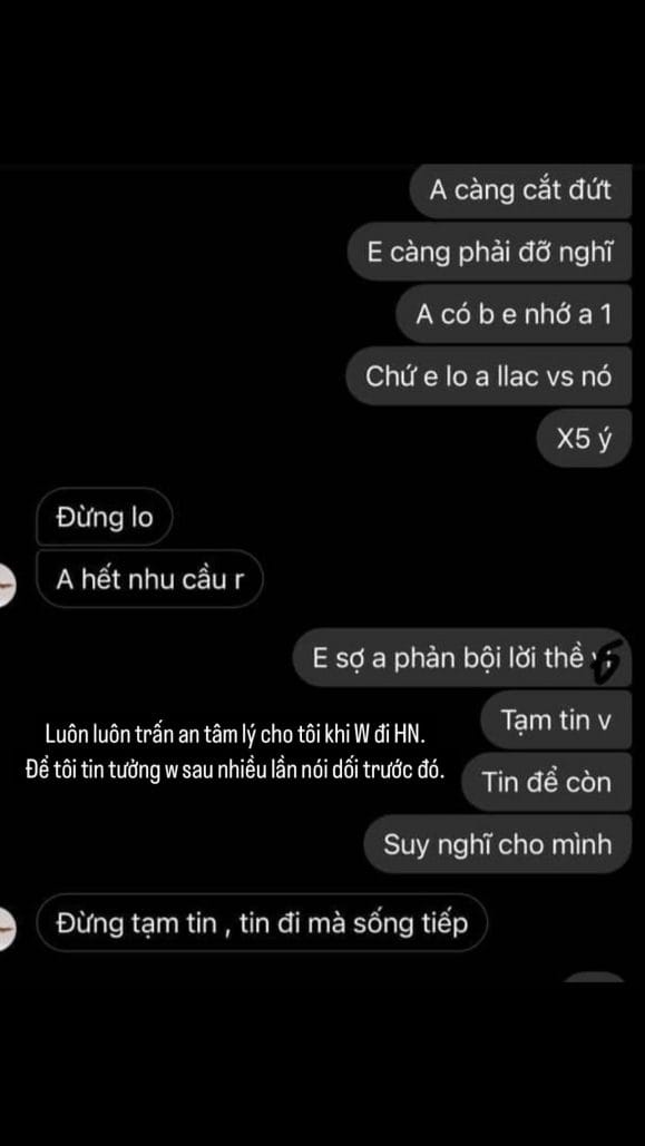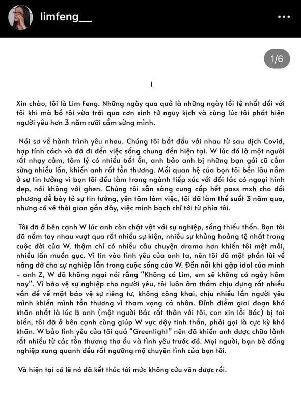 Lim Feng và W từng là cặp đôi đẹp trong mắt nhiều người, yêu nhau hơn 3 năm rưỡi. Cô chia sẻ, cả hai từng sống chung, tin tưởng nhau tuyệt đối, thậm chí sẵn sàng chia sẻ tài khoản mạng xã hội. Nhưng đằng sau đó là chuỗi ngày cô hy sinh thầm lặng, chịu đựng tổn thương để bảo vệ sự nghiệp của W.