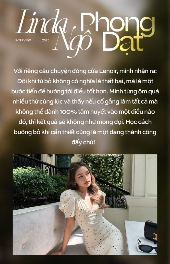 Quyết định đóng cửa thương hiệu thời trang Lenoir Studio của Linda Ngô khiến nhiều người bất ngờ. Nhưng cô chia sẻ: “Đôi khi từ bỏ không phải là thất bại, mà là cách để tập trung vào điều quan trọng hơn.”