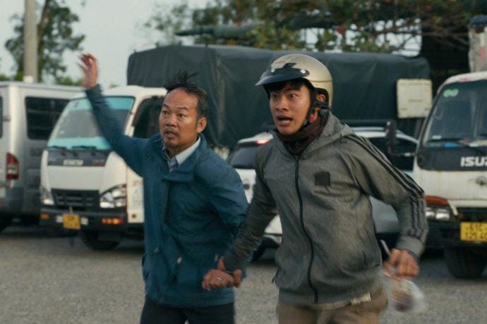 Càng về cuối trailer, nhịp phim càng dồn dập. Một bên là hình ảnh ông Phước liều mình đẩy chiếc xe máy cà tàng trên bờ đê ngập nước, một bên là sân khấu hoành tráng và khoảnh khắc nhóm The Light chật vật trước phần thi lớn.