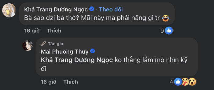 Trước những bình luận bất ngờ, Mai Phương Thúy nhẹ nhàng giải thích: “Mũi không thẳng lắm, nhìn kỹ đi”. Dù vậy, cô chưa xác nhận liệu sẽ thực hiện ý định này hay không, khiến nhiều người cho rằng đây chỉ là suy nghĩ thoáng qua.