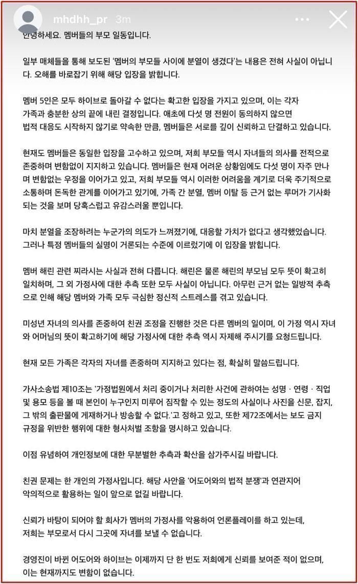 Phụ huynh các thành viên cũng lên tiếng qua tài khoản “@mhdhh_pr”, khẳng định: “Cả năm thành viên đều kiên định không quay lại HYBE. Đây là quyết định sau khi thảo luận kỹ với gia đình.” Họ cũng phủ nhận mọi tin đồn chia rẽ, nhấn mạnh sự đoàn kết giữa các thành viên và gia đình.